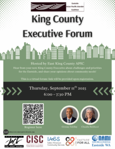 The East King County Asian & Pacific Islander Coalition (APIC) is hosting a virtual candidate forum for King County Executive. The event is scheduled for Thursday, September 11, from 6:00-7:30 pm. This event will be held over Zoom. Please register here to access the Zoom link!