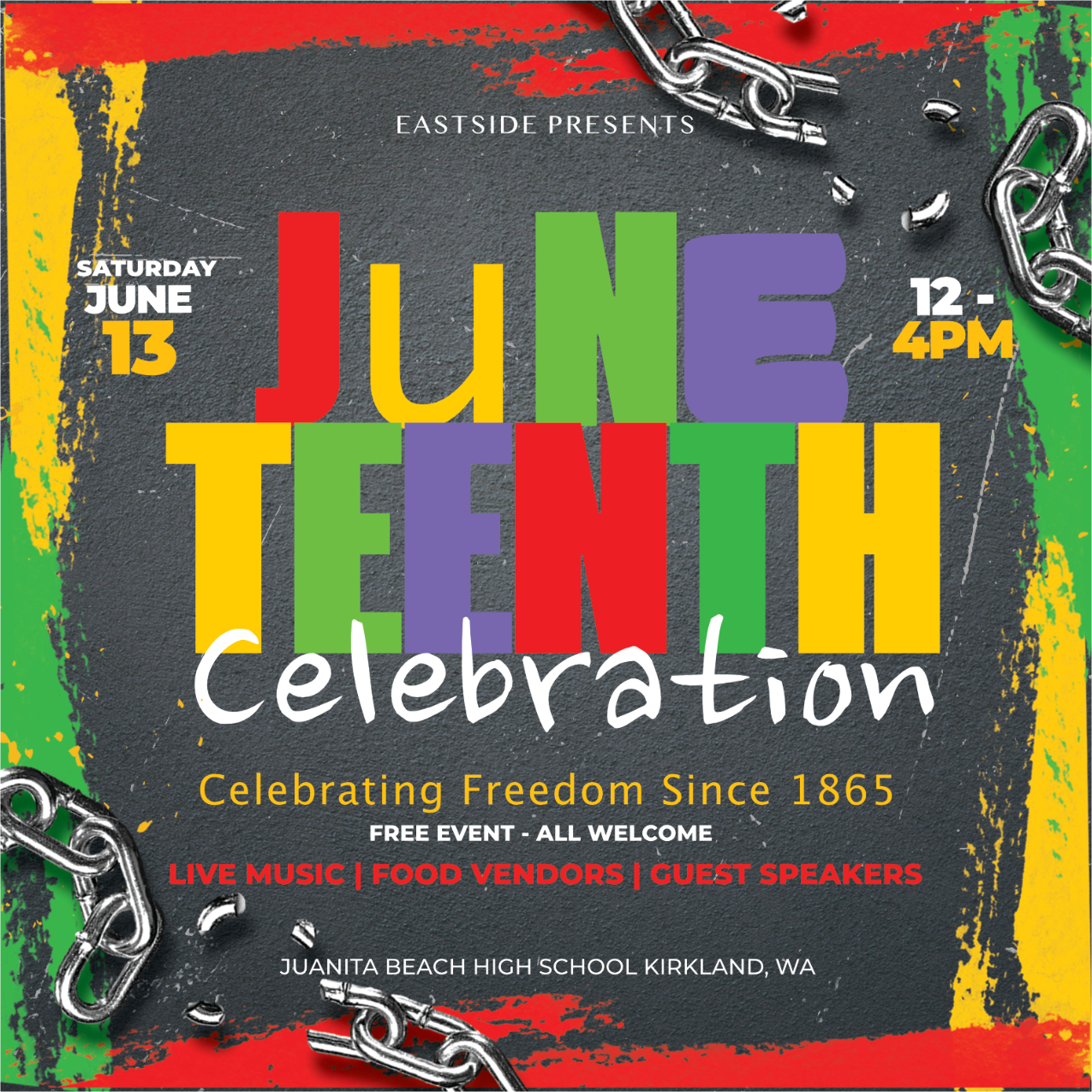 The community celebration has been hosted by local Black leaders and community members since 2020 with representatives from the Lake WA School District, BAM (Blacks at Microsoft), Eastside For All’s staff and board, local entrepreneurs, educators, artists, and community advocates. It’s time for the 7th annual event!