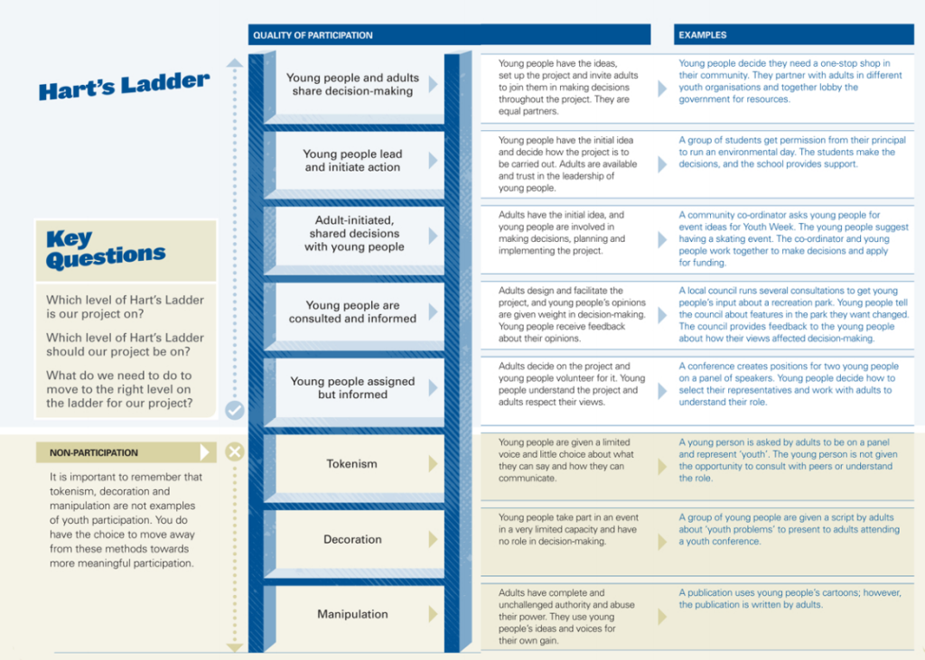 We love this adaption of Arnstein’s Ladder of Citizen Participation. Although it’s about youth participation, it’s relevant for any group that’s been historically excluded and marginalized from decisions-making processes.